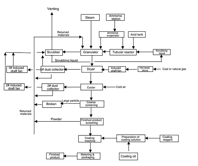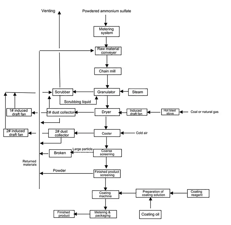 The granulated material is then processed through drying, cooling, screening, surface coating, and packaging, producing spherical granular ammonium sulfate.