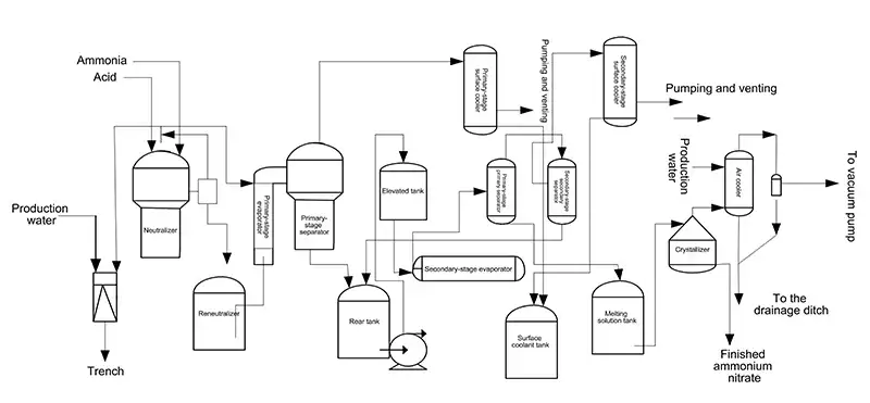 The crystallization process mainly consists of the following steps: neutralization of gaseous ammonia and nitric acid, ammonium nitrate solution evaporation, vacuum crystallization, product packaging, waste vapor neutralization, and condensation of evaporated steam.