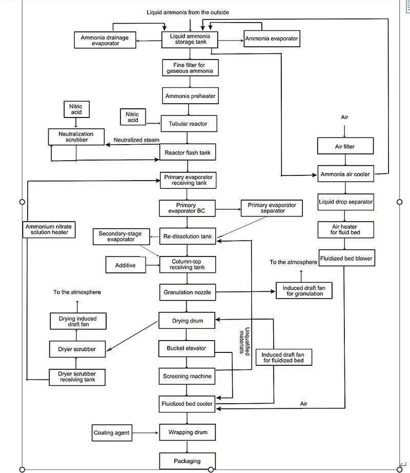 In the granulation process, gaseous ammonia reacts with nitric acid in a pipe reactor to form ammonium nitrate solution, which is discharged into a flash tank. After flashing, the solution enters an evaporator, where it is concentrated to approximately 96 wt%, and then flows into an evaporation separation vessel and a remelt tank.
