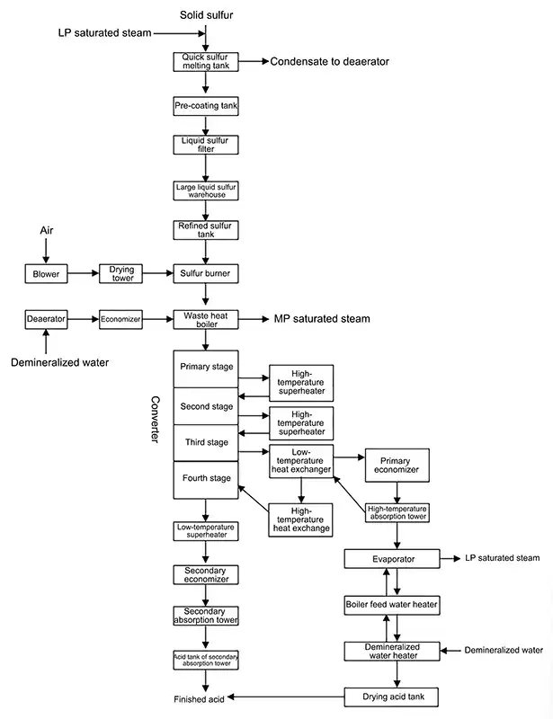 - Air blower, combustion furnace, waste heat boiler, superheater, cooling tower, cooling tower circulation pump, gas cooling and scrubbing section, dilute acid cooler, scrubbing circulation pump, scrubbing tower, safety water seal, electrostatic mist eliminator