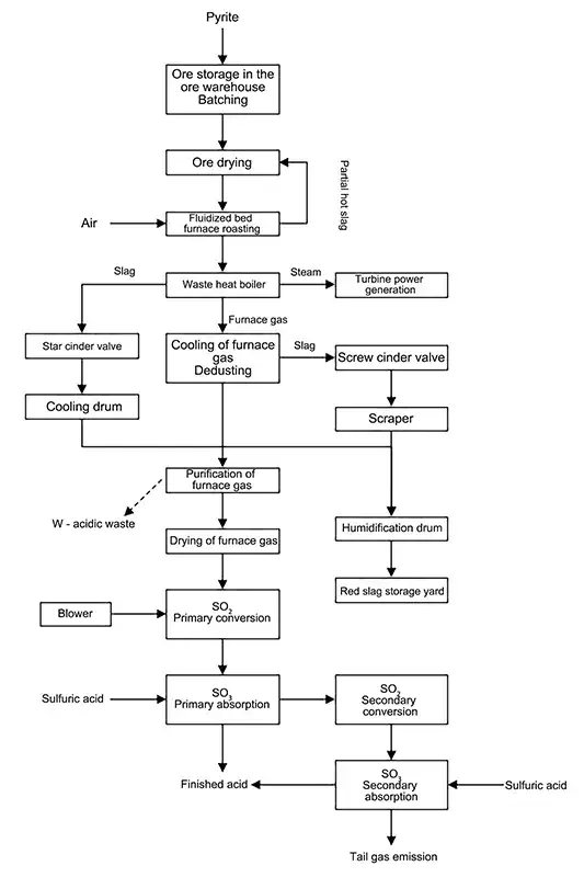 The pyrite-based process consists of the following main sections: raw material handling, roasting, SO₂ generation and gas purification, air drying and SO₃ absorption, conversion, and waste heat recovery.