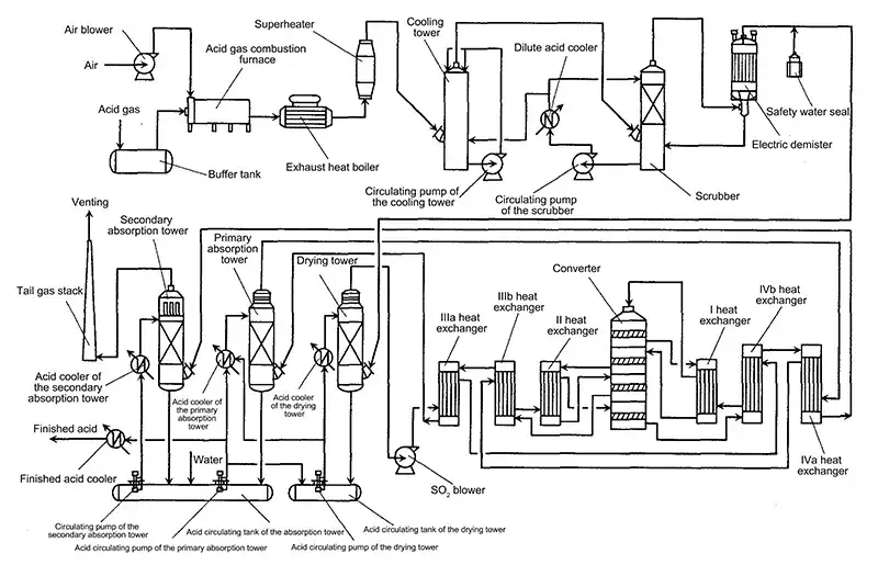 In the dry process, moisture in the furnace gas generated by acidic gas combustion is removed as thoroughly as possible. This process route is similar to the conventional pyrite-based sulfuric acid process: the furnace gas undergoes washing, dewatering, and demisting, followed by drying, resulting in essentially moisture-free SO₂ gas. The dry SO₂ is then catalytically oxidized to SO₃, which is subsequently absorbed to produce sulfuric acid.