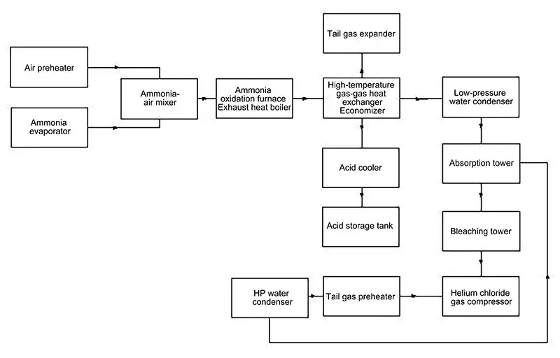 Based on the ammonia oxidation pressure and the absorption pressure of nitrogen oxides, dilute nitric acid production technologies can be classified into the following five routes: Atmospheric-pressure process, combined-pressure process, medium-pressure process, high-pressure process, dual-pressure process.